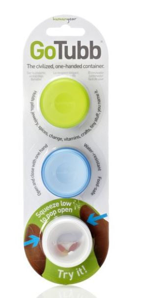 GoTubbs work great with pills, knick-knacks, snacks, vitamins, change, bits-n-piece, you name it. A recessed, textured labelling area resists being rubbed off, and the transparent tops let you see what's inside without opening them.